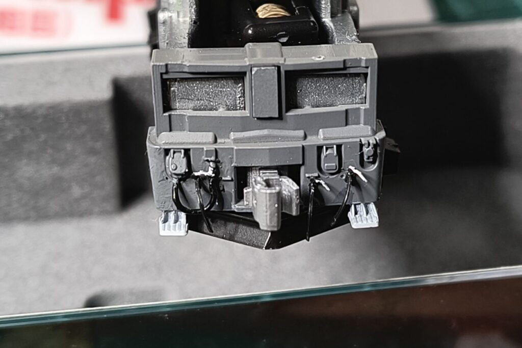 機関車ではド定番の加工ですが、製品のモールドをデザインナイフで削り取り、スカートを再塗装したうえで、エアホースと電気暖房用ケーブルを別パーツ化しています。エアホースはコスパの良い工芸社、電気暖房用ケーブルは手持ちパーツがなかったので真鍮を焼きなまして曲げたものです。