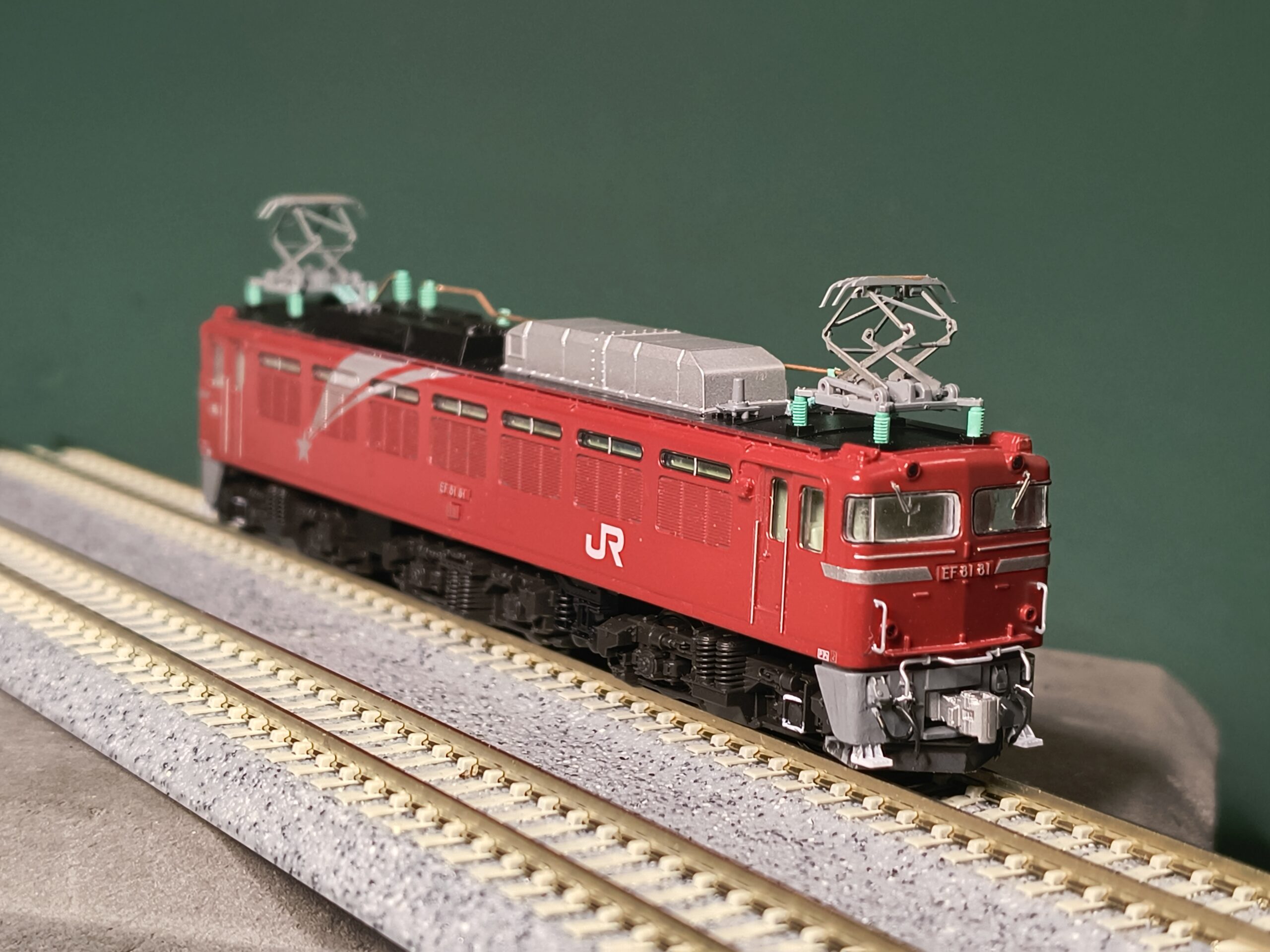 製品の出来は、いつものKATOのEF81という感じです。印象把握は良好、細かい標記もきれいに入っているほか、碍子が別パーツであることもあって、製品状態そのままでもそれなりの情報量があります。